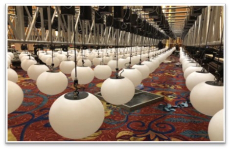 ★備注:1.單個(gè)球體功耗為50W。2.從吊機(jī)掛鉤到球體底端高度為1.3米。3.兩球之間中心距根據(jù)實(shí)際應(yīng)用場(chǎng)景隨意調(diào)整、最小為50cm。